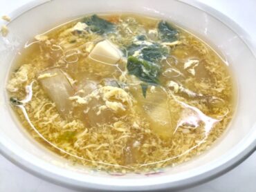 ”かきたまスープ”には、高岡産のホウレンソウが入っており、鶏がらスープの効いたやさしい味わいです。