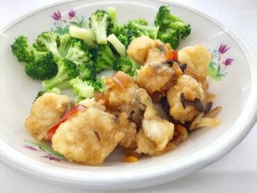 ホキ、人参、玉ねぎ、赤ピーマン、生しいたけ、黒きくらげが入ったあんかけに”茹でブロッコリー”が添えてあります。