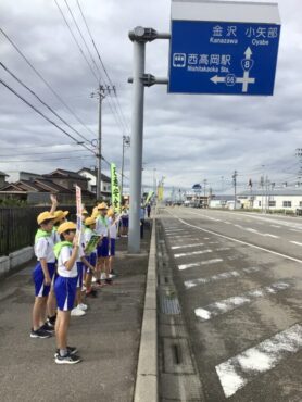 沿道から、行き交う車に交通安全を呼び掛けます。