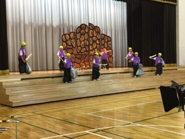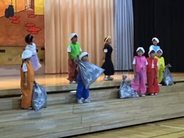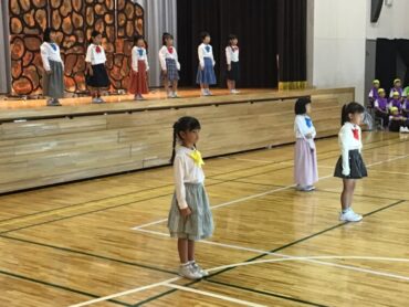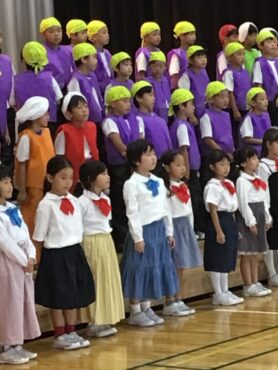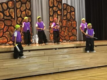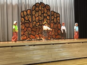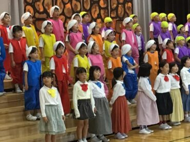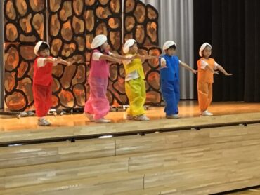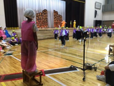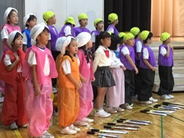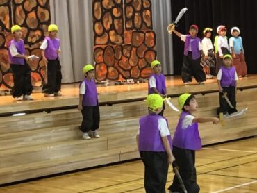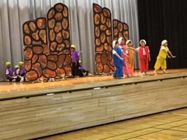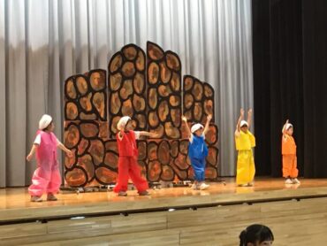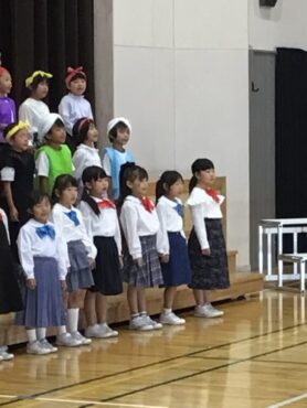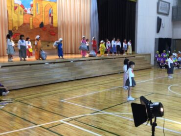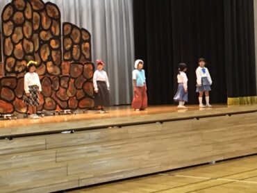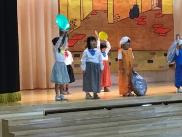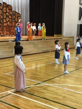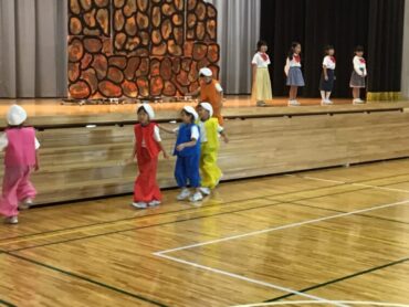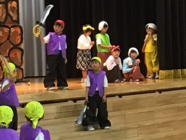 2025.10.4 1年生 学校行事 1年 学習発表会ステージ発表 プログラム2番 1年 劇 「アイウエオリババ」 ペルシャの国を舞台に、かわいい1年生が、楽しい物語の世界を繰り広げました。 カラフルな衣装を身に付けた子供たちの生き生きとした演技は、観るものを笑顔にしてくれました。 大きな拍手をいただいて、初の大舞台を終えることができ、子供たちも大満足でした。