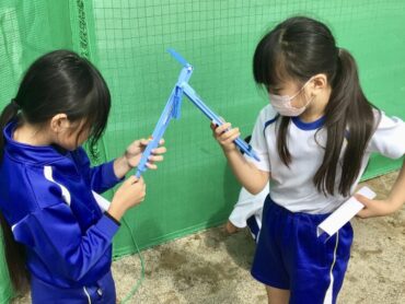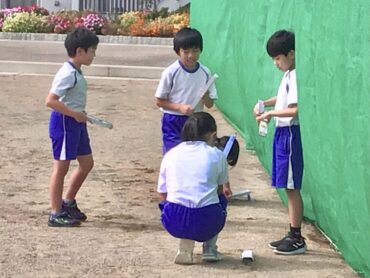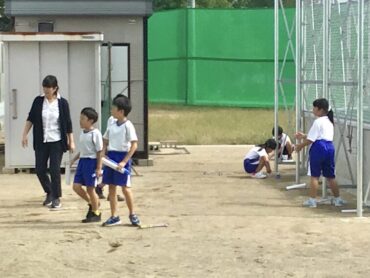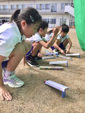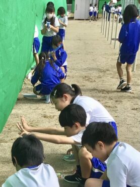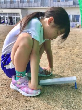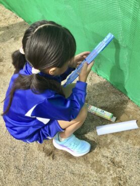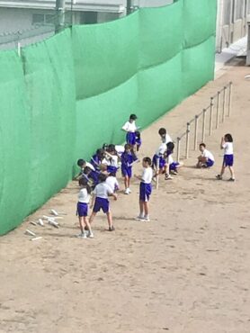 3年生の子供たちがグラウンドに出て、理科の学習をしています。