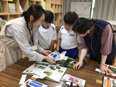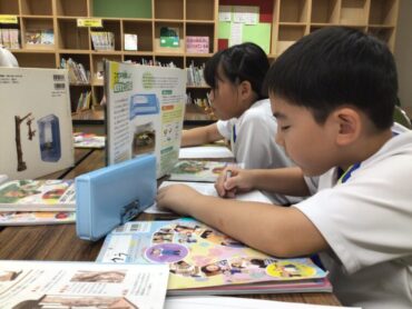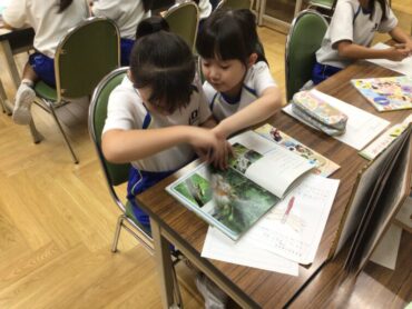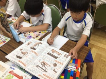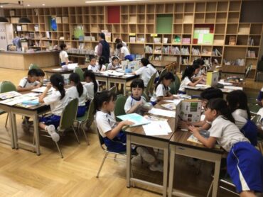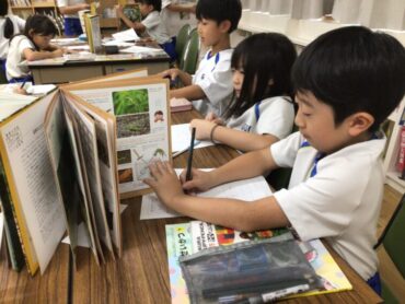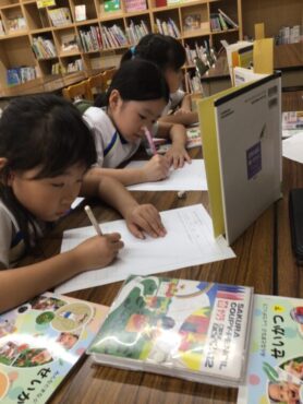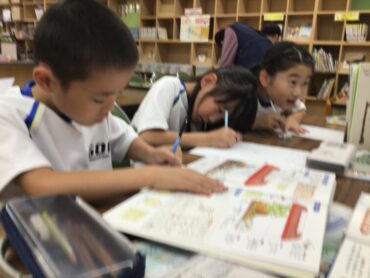 2年生の子供たちが、図書室で調べものをしています。