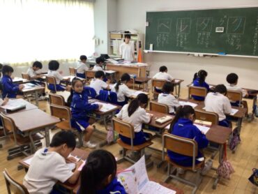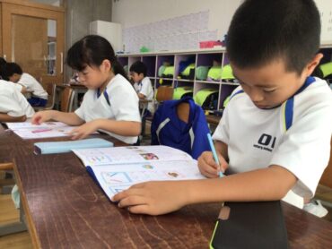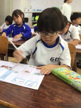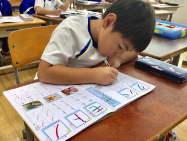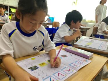 始めに、指で空文字を書いて、字形と筆順を確認します。