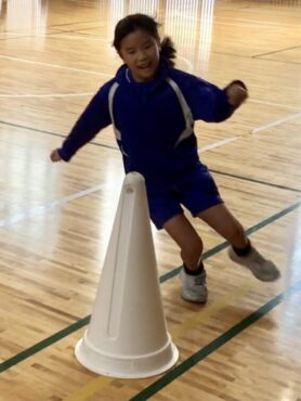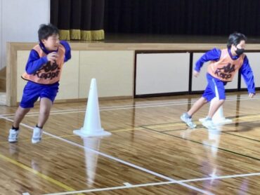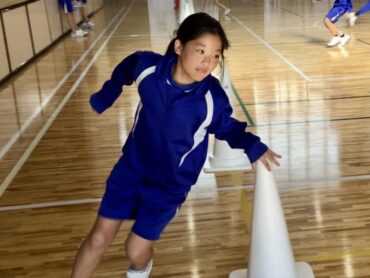 体育館のステージ前に置かれたコーンで折り返して…
