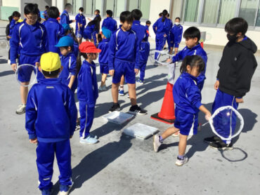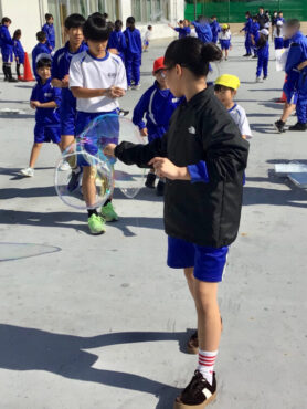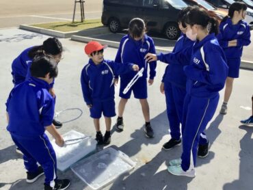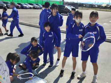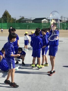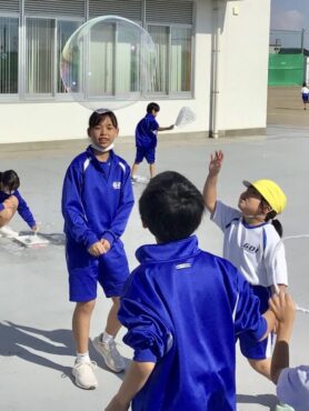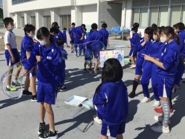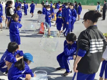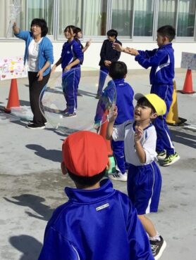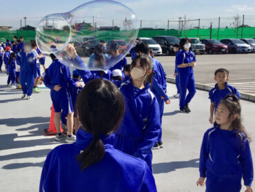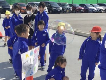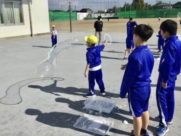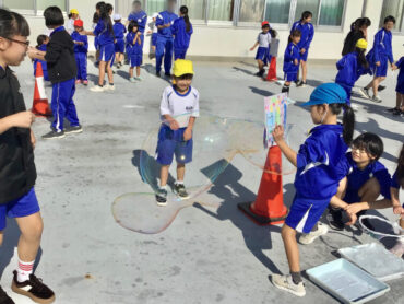 1年生が、保育園交流で使用した”魔法のしゃぼん液”を使って…