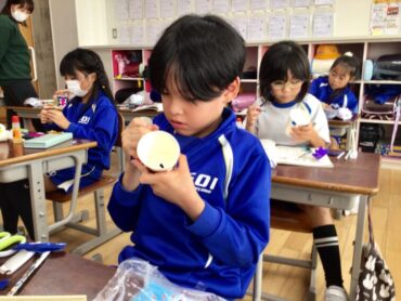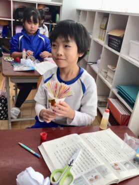 国語の時間に、教科書に載っている”紙コップ花火”を作っています。