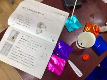 教科書の”紙コップ花火”の作り方を読みながら、実際に作ってみます。