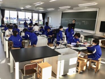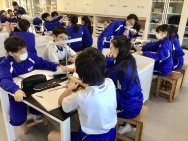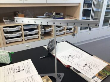 理科室で6年生が、てこ実験器と”にらめっこ”しています。