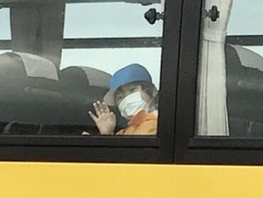 1年生のたくさんの笑顔を乗せて、バスが出発します。