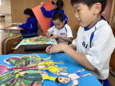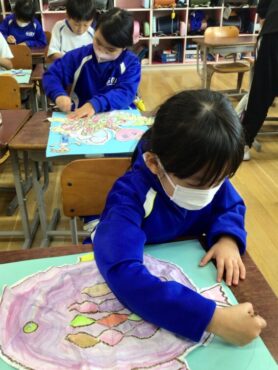 クレパスで下絵を描き、水彩絵の具でカラフルに着色しています。