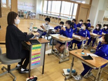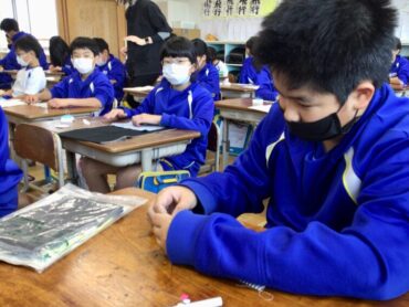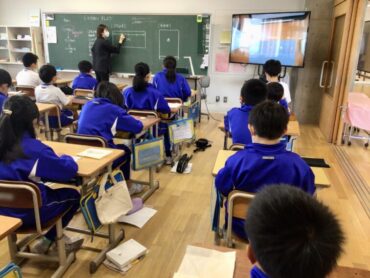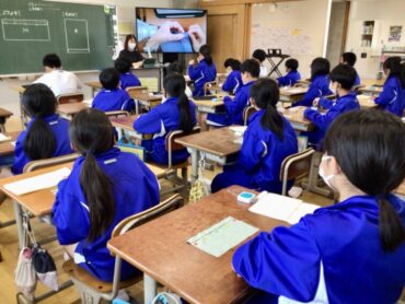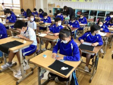子供たちは、大型モニターで確認しながら、しつけのかけ方を学びます。