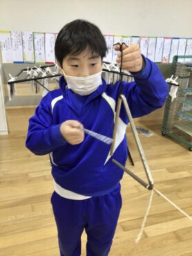 トライアングルと紙コップをたこ糸でつないだ糸電話を使って、調べてみます。