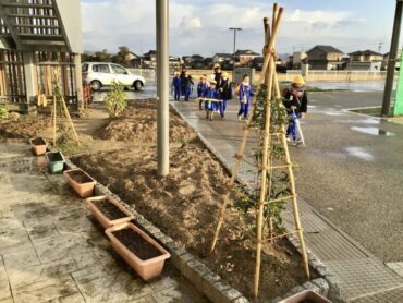 昨日、花と緑の推進協議会の方々と3年生が花苗を抜き取った花壇の低木は、雪囲いされて冬に備えています。