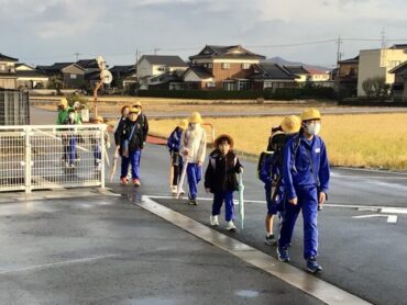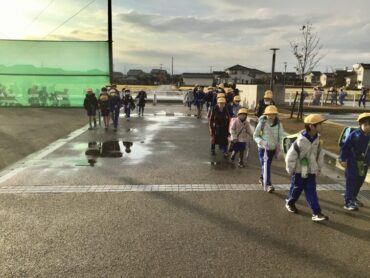 明け方には、雨が上がり、濡れた通学路を子供たちが登校してきます。