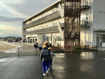 登校してくる子供たちを、斜めからやさしく照らし、影が長く伸びています。