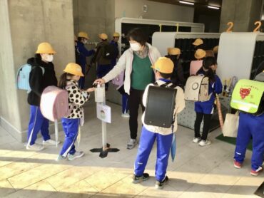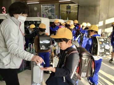 登校時は、養護教諭が児童玄関に立って、手指消毒を促しています。