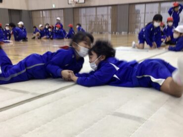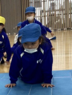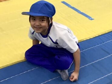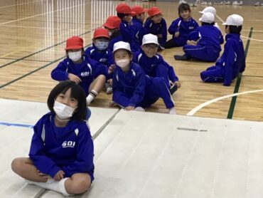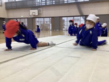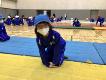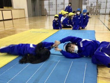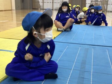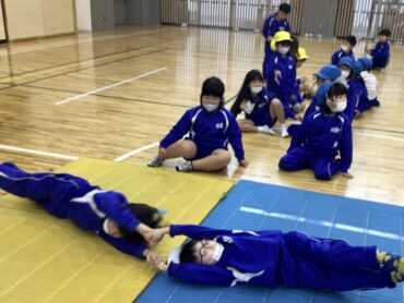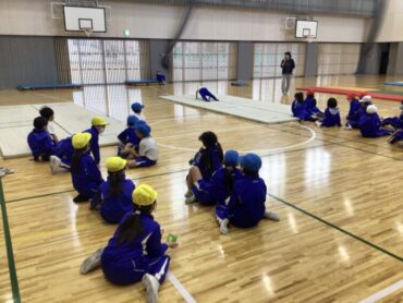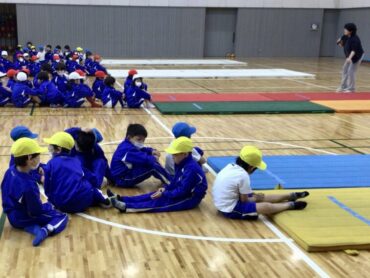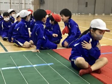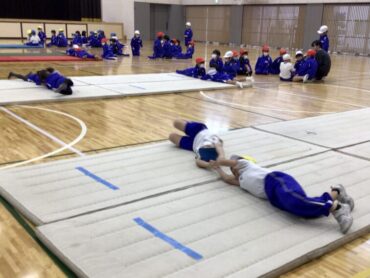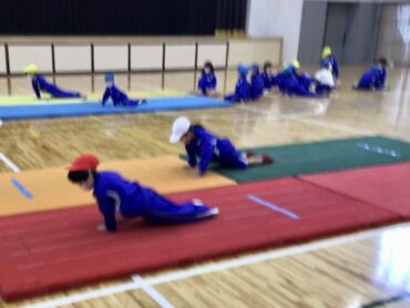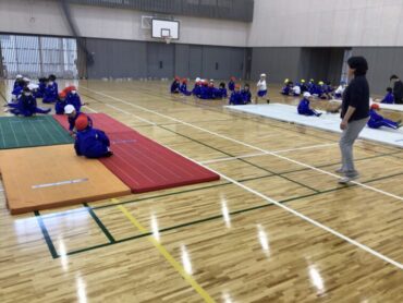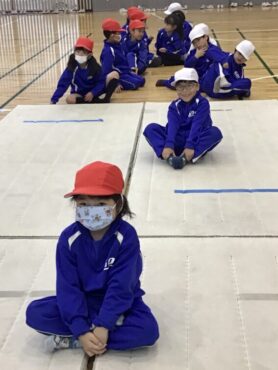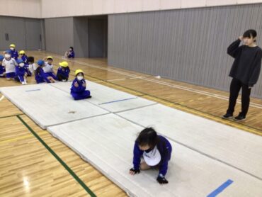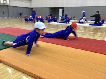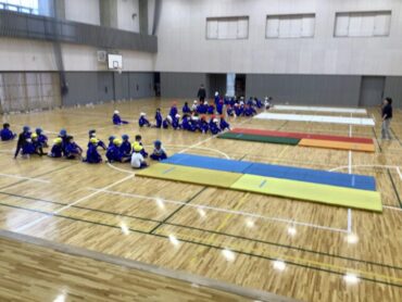 1年生の子供たちが、体育館でマット運動に取り組んでいます。