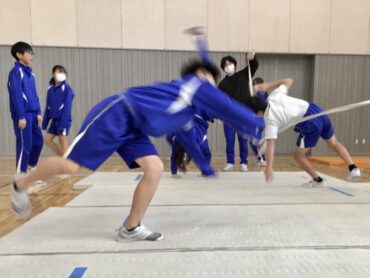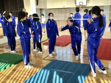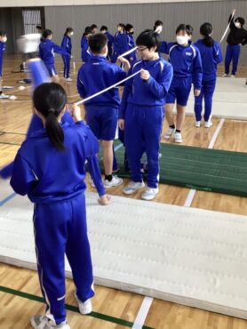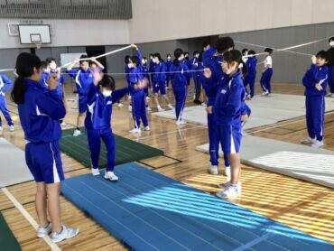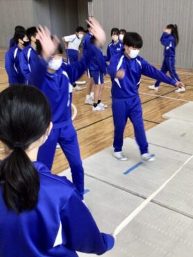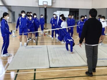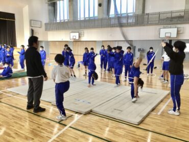 6年生は、”側方倒立回転”に挑戦すべく、先生のお手本を見ています。