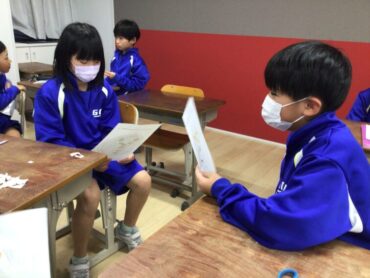 どんなパフェができたのか、隣の友達と紹介し合います。