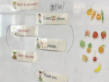 「What do you want? (何が欲しいですか?)」「I want peach please. (桃をください。)」