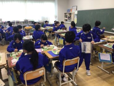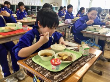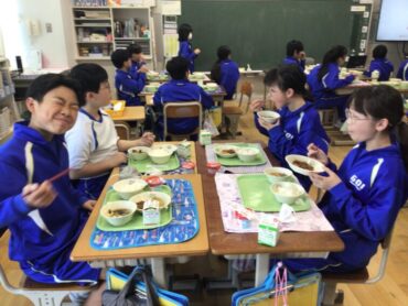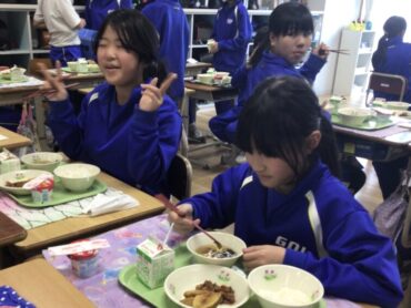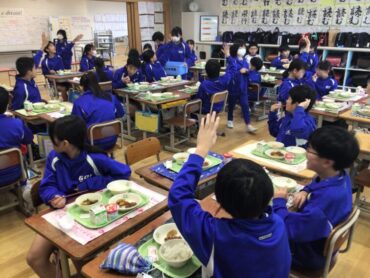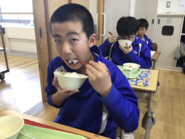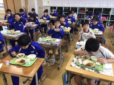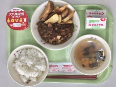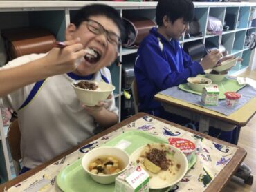 今日の給食は、月1回の”食19丼”です。
