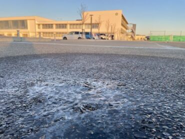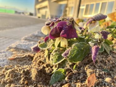 花壇のパンジーに降りた霜は、朝日を浴びてキラキラ光っています。