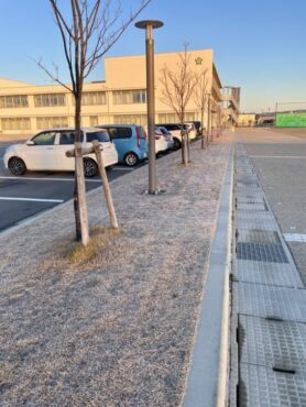 朝は冷え込んだので、枯れた芝生には、うっすらと霜が降りています。