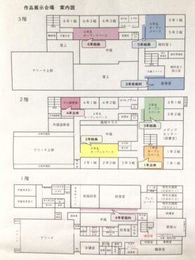 各学年の作品展示会場の案内も掲示されています。