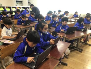 1年生は、学習専用端末でタッチ操作とタイピングの練習