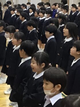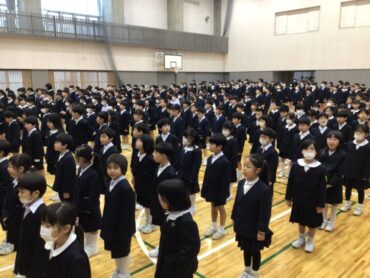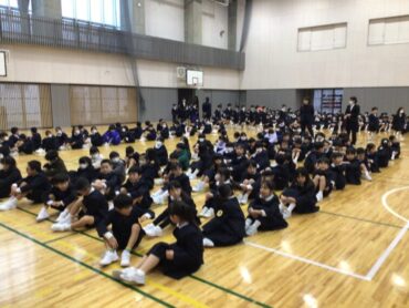 早朝からジェットヒーターを炊いて温められた体育館に、全校児童が集合します。