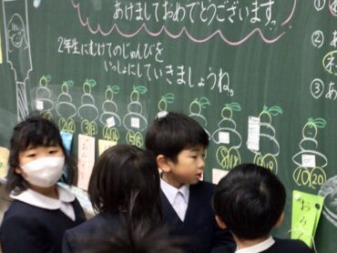 教室では、黒板前に集まって先生が用意した”おみくじ”に、ネームプレートを貼る子供たち