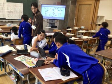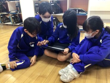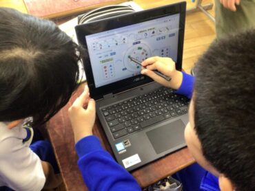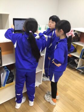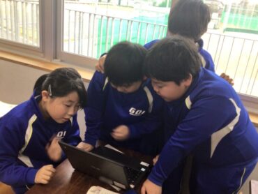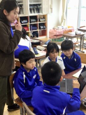 3年生が、頭を寄せ合って学習専用端末をのぞき込んでいます。