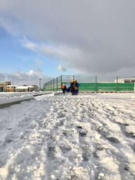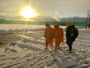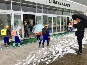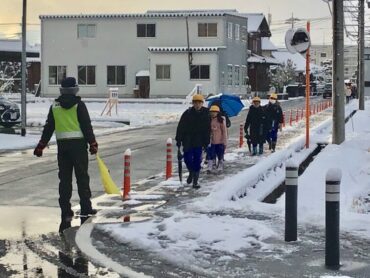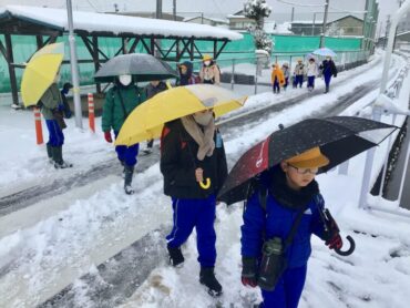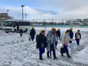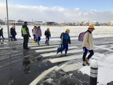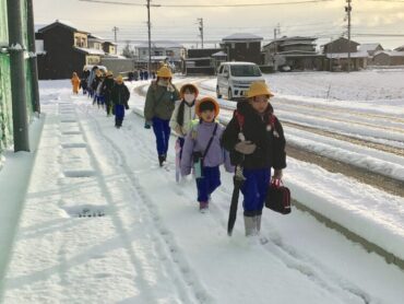 こんな雪の日も、きちんと一列に並んで歩く子供たちは立派です。