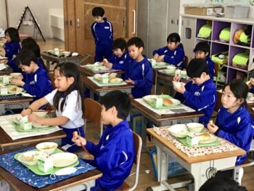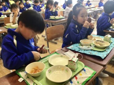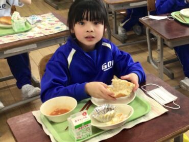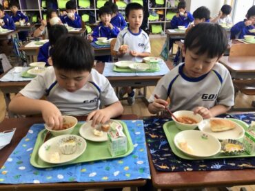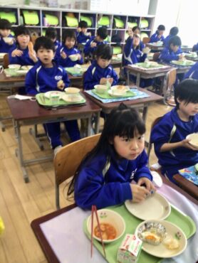 2026.1.21 1年生 給食 給食風景 給食の時間は、子供たちが楽しみにしている時間です。 4時間目まで、がんばって活動した日には… 給食が、いっそうおいしく感じられます。 今日は、”コッペパン”に”フルーツヨーグルト和え” ”コーンエッグ”に”ミネストローネ”と、人気のメニューです。 1年生は、入学当初から比べると、食べる量がかなり増えました。 栄養満点の給食をモリモリ食べて… 午後からも元気に学校生活に取り組んでほしいものです。