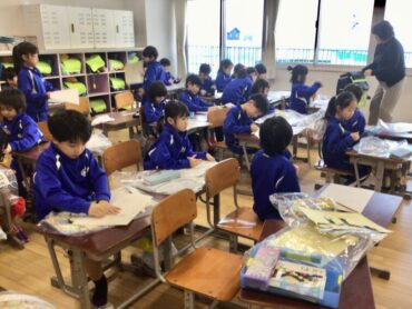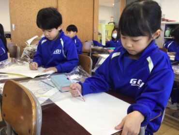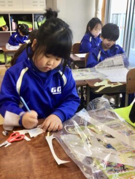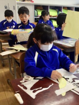 1年生の子供たちは、ステンシルの型紙づくりに取り組んでいます。