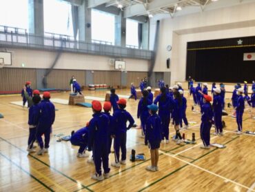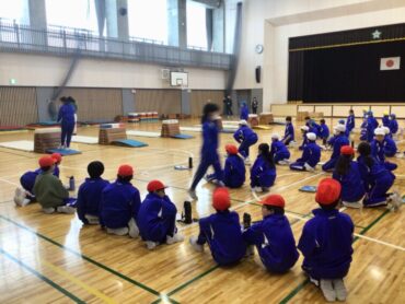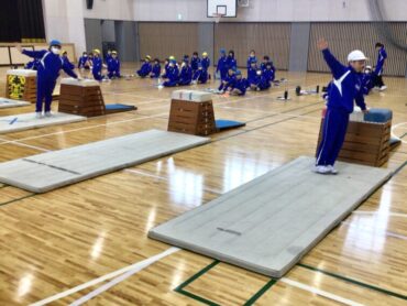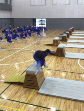 5年生が跳び箱の”横跳び越し”に取り組んでいます。