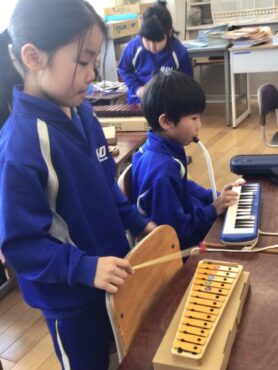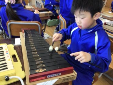 1年生の教室に卓上用の木琴と鉄琴が持ち込まれました。