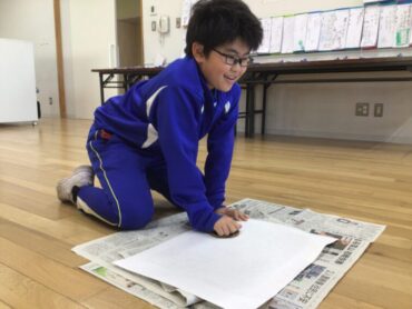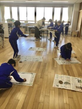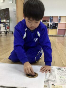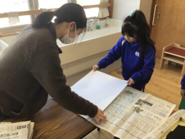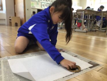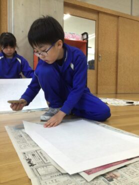 先生といっしょに、和紙をかぶせます。