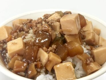 ”麻婆豆腐”をご飯にかけて、”高岡冬野菜の麻婆丼”のできあがりです。
