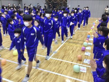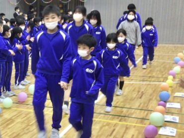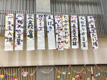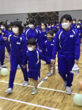 体育館には、6年生を迎えるために5年生が作った風船の花道ができています。