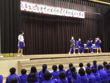 5年生の進行で、いよいよ「6年生に今までのありがとうを伝えよう集会」が始まりました。